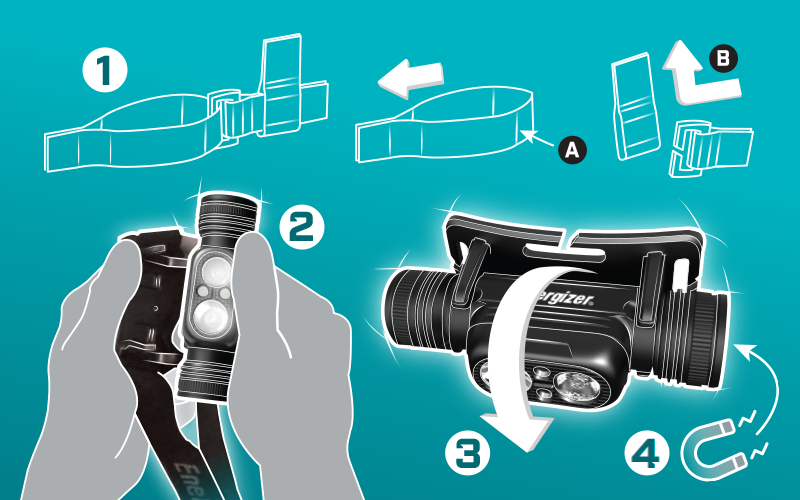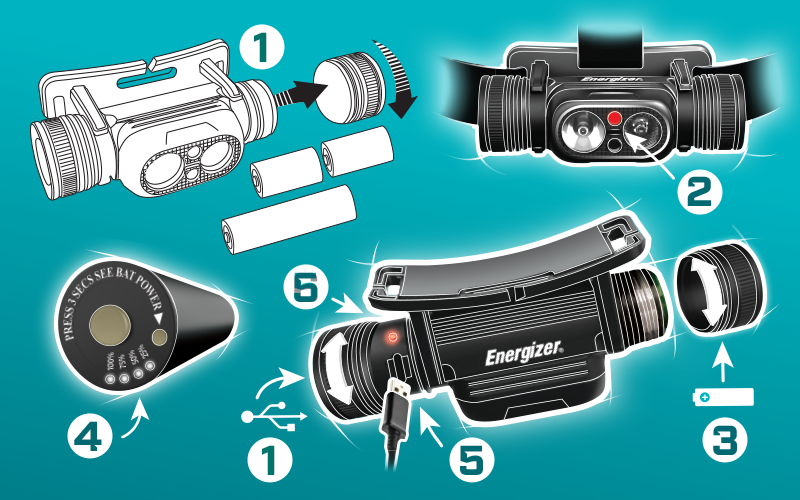 Dévissez l’embout avec l’icône de pile pour accéder aux piles. Suivez le schéma sur le corps de la lampe pour l’orientation des piles.
