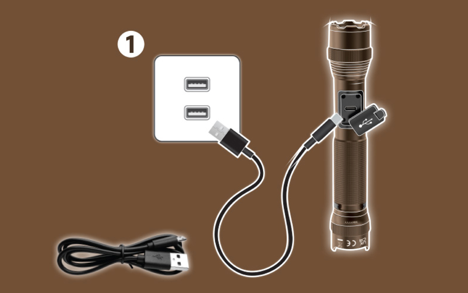 Pour charger, utilisez le cordon USB inclus et branchez la lampe dans n’importe quel port de chargement USB.