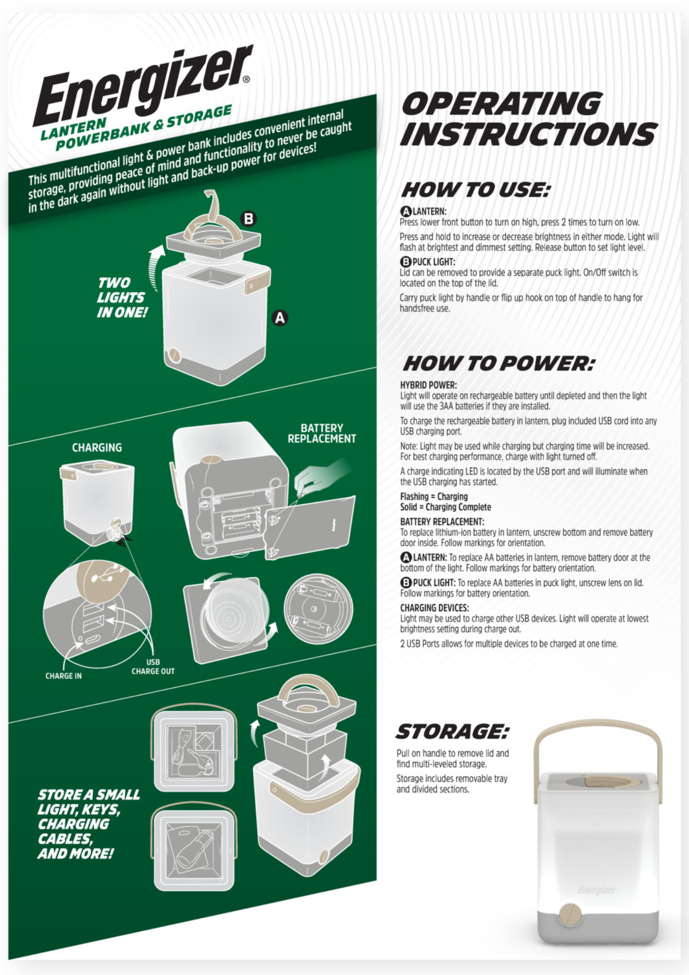 To charge the rechargeable battery in lantern, plug included USB cord into any USB charging port.